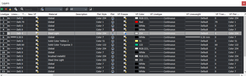 Note the VP prefix on the layers panel indicates how the layer appears in a given viewport.